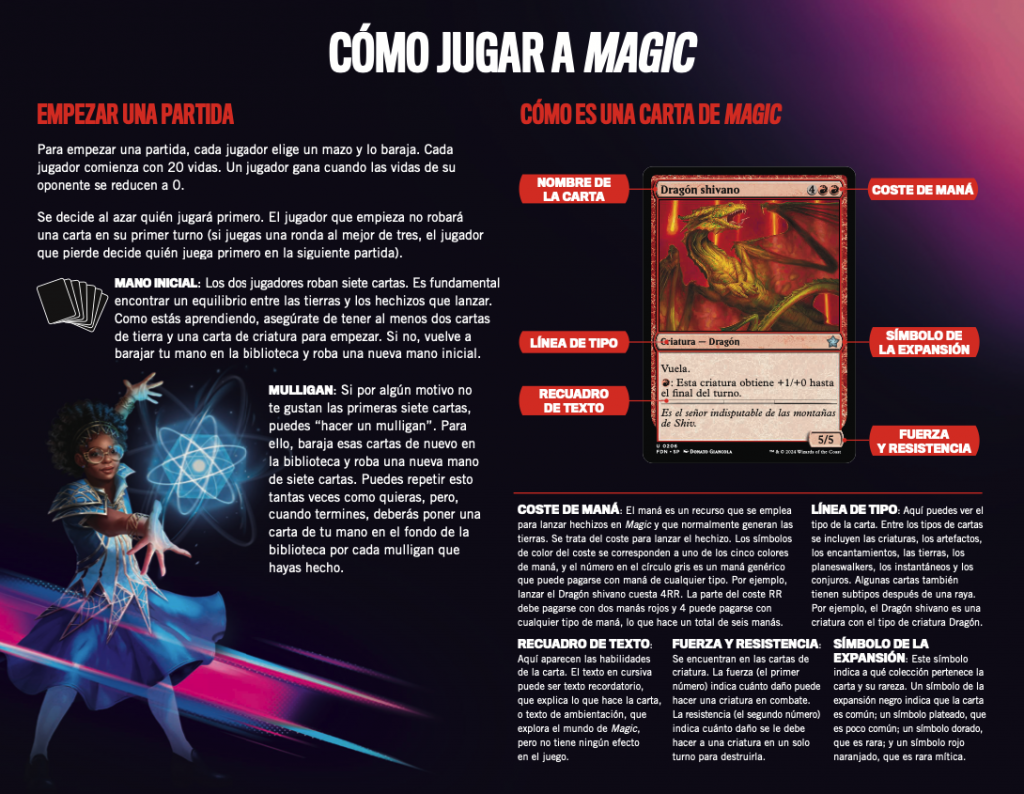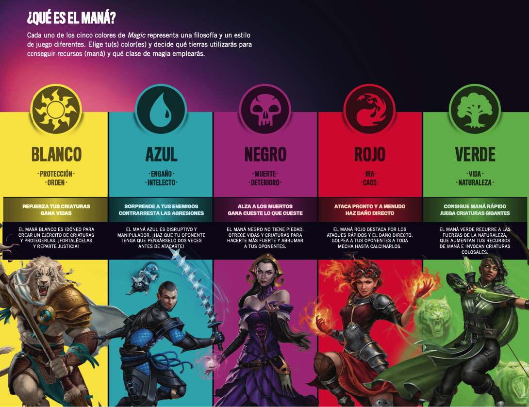 Cada jugador construye su propio mazo y se enfrenta a otro jugador utilizando criaturas, hechizos y estrategias basadas en cinco colores de magia: